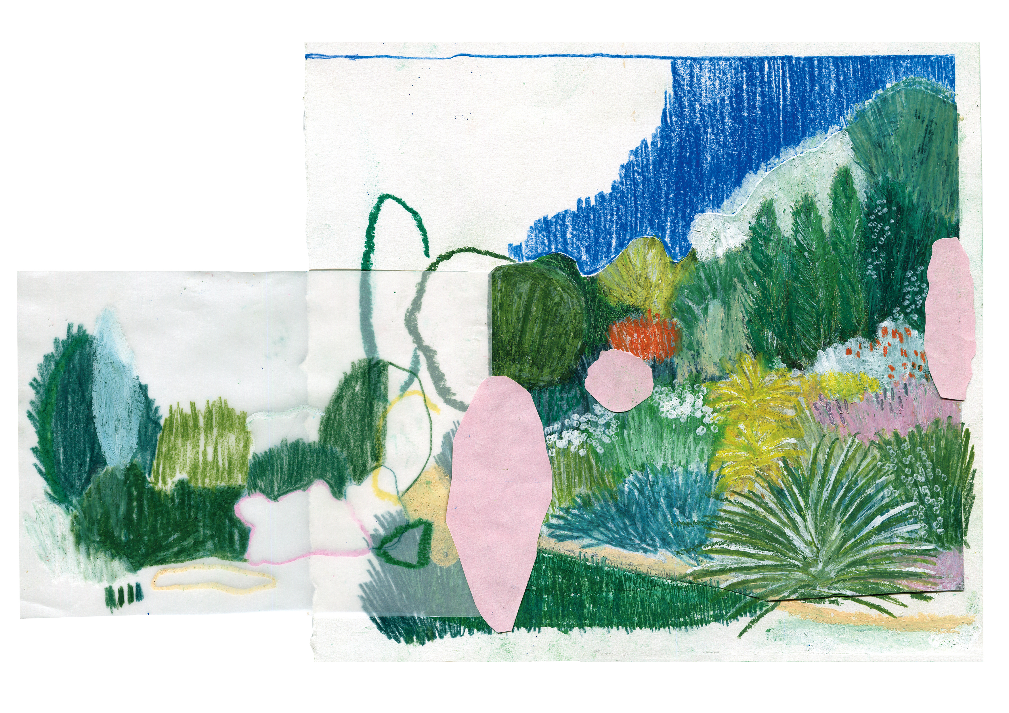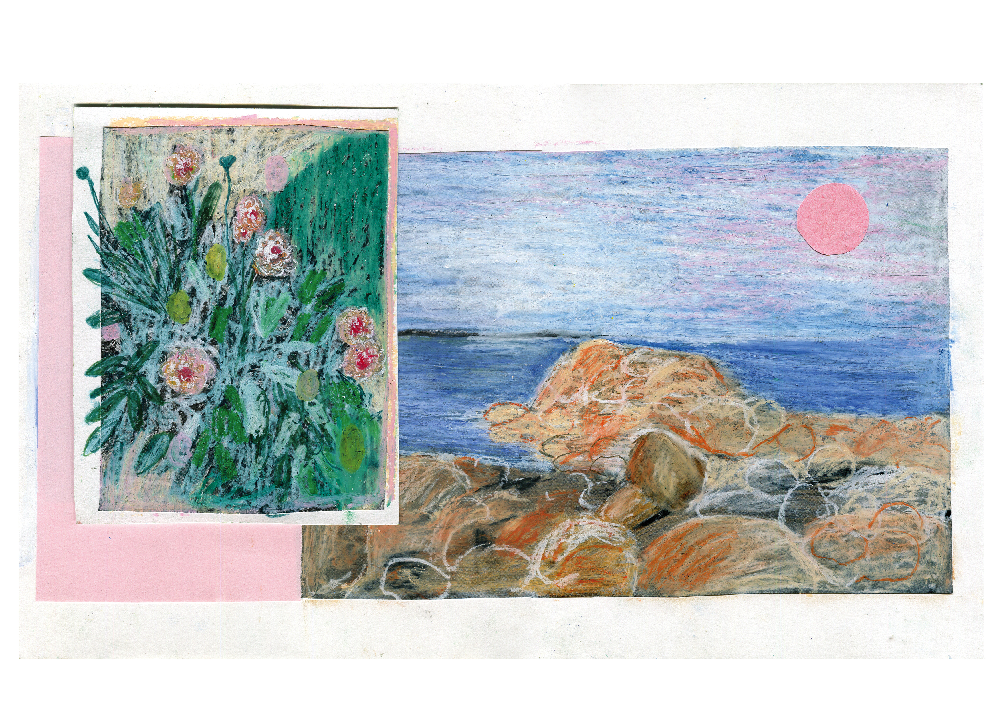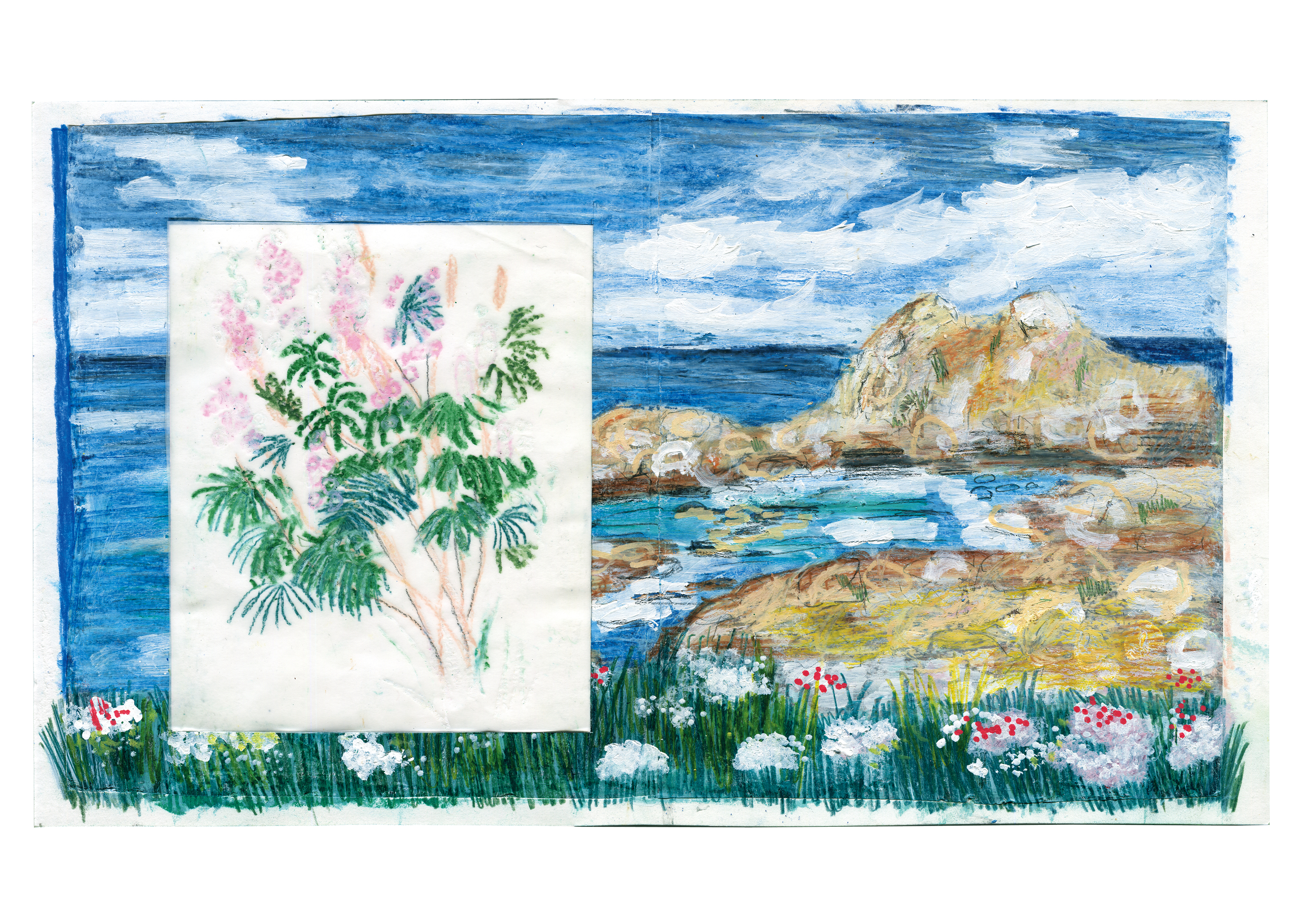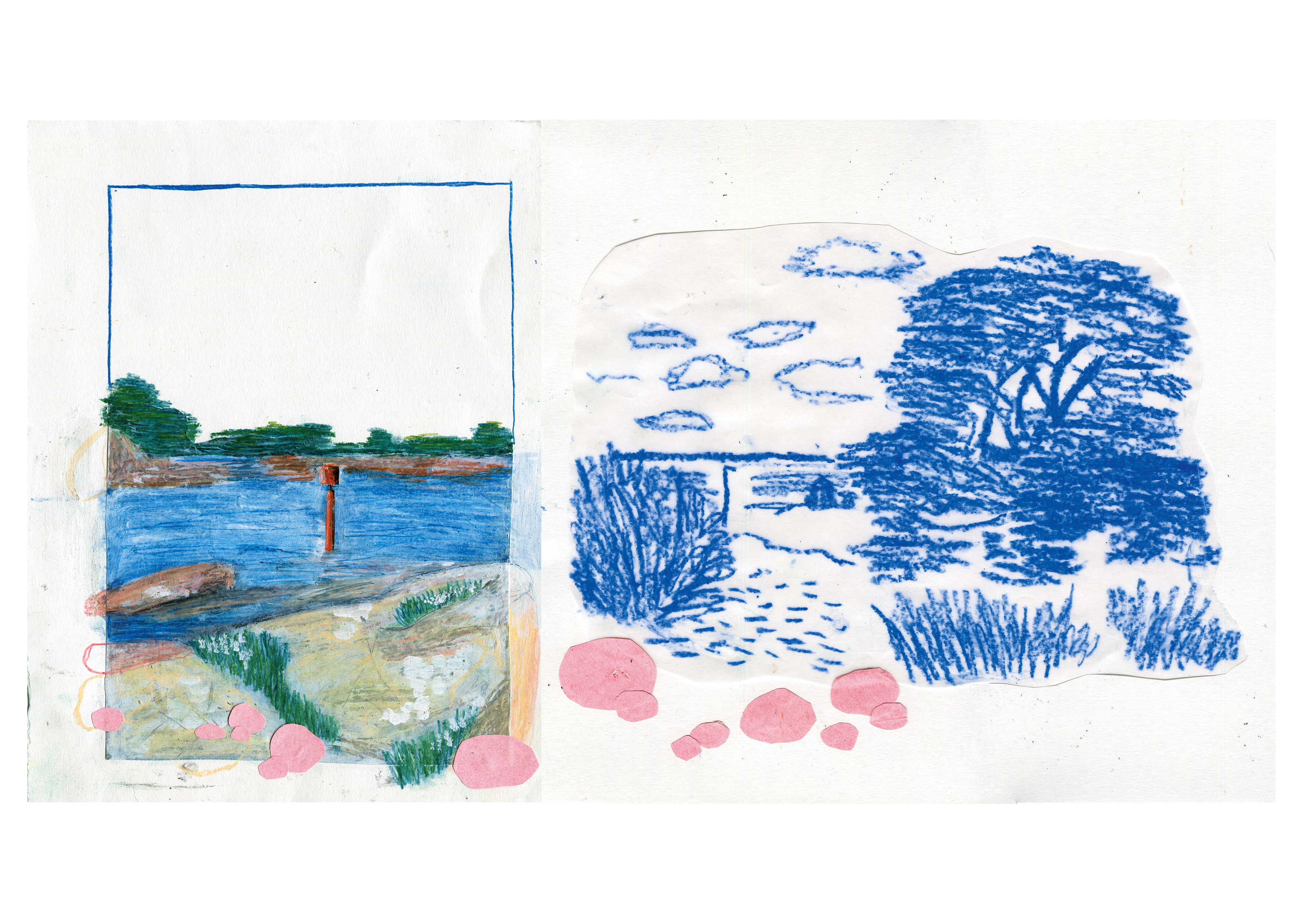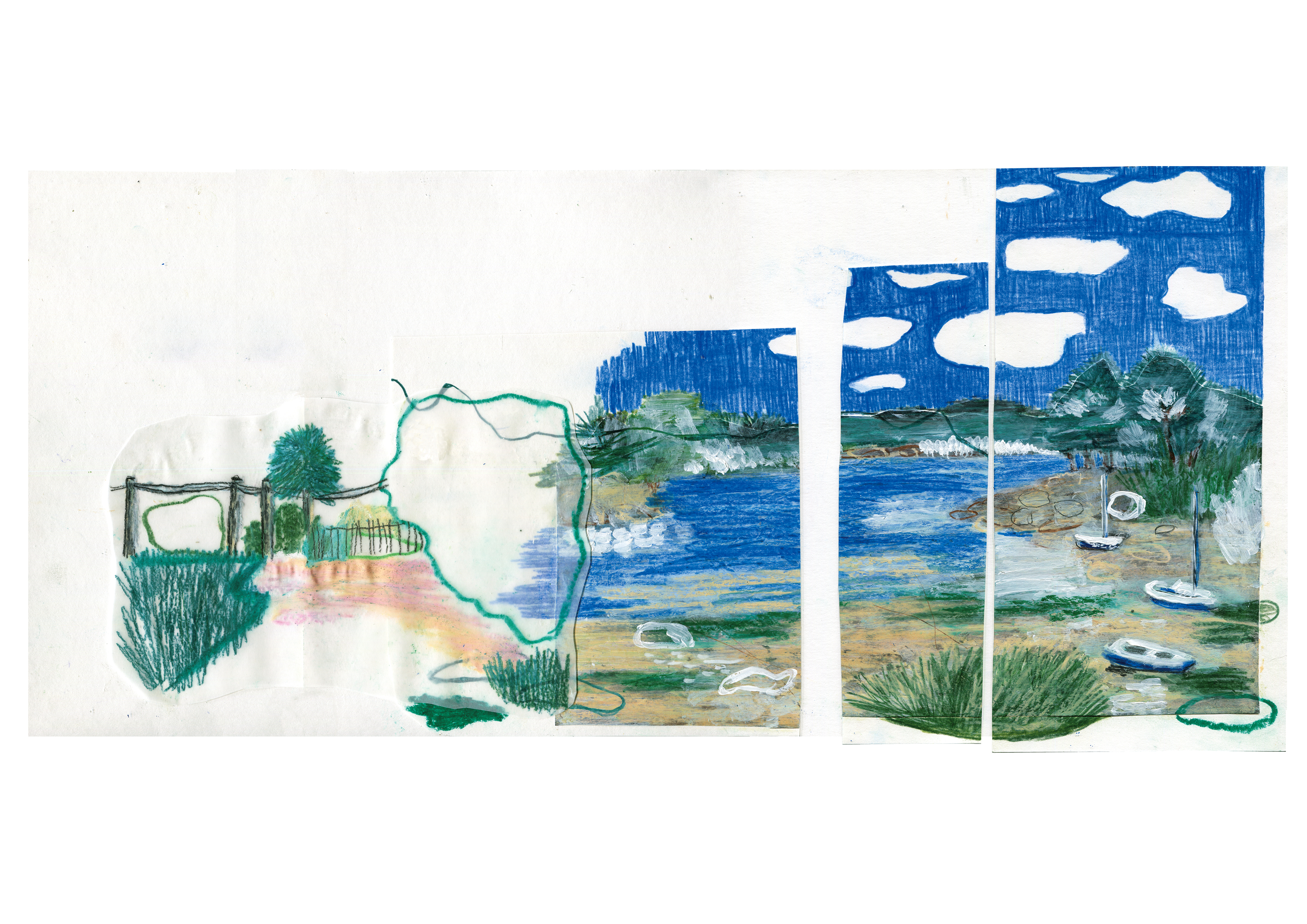 In de zomer van 2024 ging ik naar Bretagne. Deze collages zijn mijn reisverslag. Collage, oliepastel, potlood, stift en acrylverf op papier